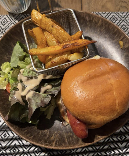 We had a fabulous salad and what I’m sure it is the best burger in town. The waitress in charge was absolutely excellent in all aspects. Top service. The other one was pleasant but needs some training/experience. We actually recommended the place to a family who were hesitating whether to come in as we left. Gave 4 stars to service for the helper waitress being a bit confusing with the wine and language (she insisted in speaking English even though I speak French and am not English native). 4 stars to atmosphere for the massive TV screen with a fireplace image in it and the draft from the automatic doors opening up every time somebody approached...
