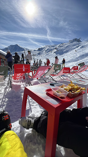 Lovely location and good bar service - but thatâs about all. Experience spoiled by chaotic food service (it really wasnât very busy), ridiculous prices (âŹ20.50 for two small bowls of over-cooked chips⊠wow!). Inside, the tables are too close with too many chairs (and the tableâs depth makes it frustratingly difficult to sit at in ski boots). At least thereâs a real fire - but you really canât see it unless youâre the lucky table slowly baking to death right in front of itâŠ...