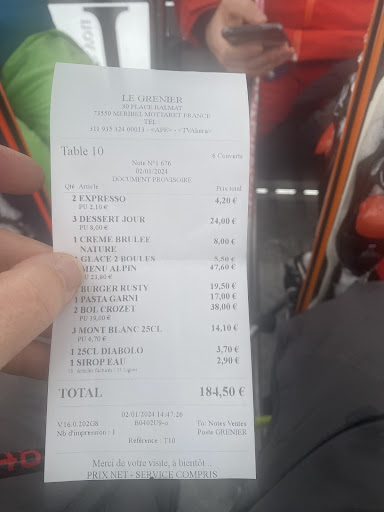 Read moreMalgré un serveur très aimable, ce qui est dans l’assiette est très en dessous de la note attribuée par Google. Film plastique dans les carbonata à 17€, plat du jour 24€ avec une 1/2 portion de filet de bœuf à moitié en nerf, croset ok et dessert ok. Le grenier est à éviter en fin de service. Dommages, j’en avais un meilleur souvenir.(modification suite à la réponse). Je retournerai pour tester à nouveau en février. Merci de...