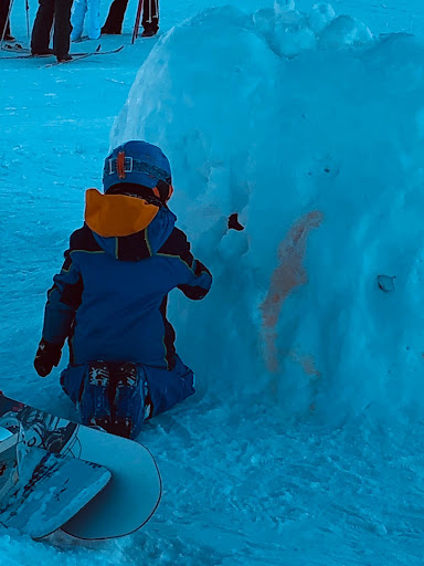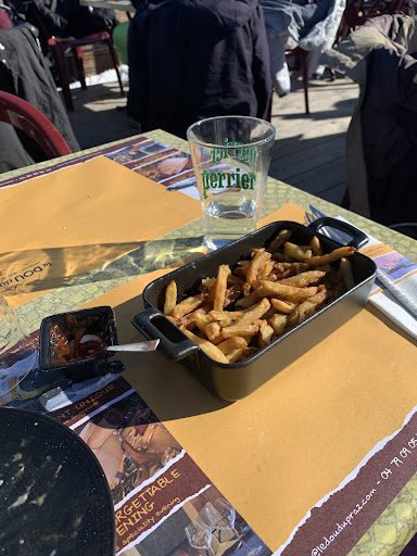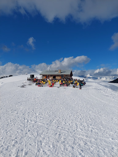 Terrasse bien exposée mais en hiver, il faut manger en manteau quand même. C'est en hauteur de la Plagne Soleil. Accessible depuis le téléski Dou du praz (en face à 50-100 m, pas trop besoin de pousser sur les bâtons) ou a pieds en balade (en haut de la piste de ski Dou du praz).