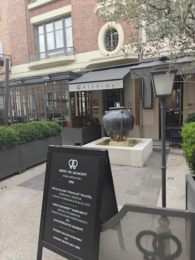 Read moreÉté 2023 Encore une "cher" déception comme souvent dans les centres villes trop fréquentés. L'Alchimy fait comme beaucoup et tristement n'invente rien. Nous n'avons là qu'une brasserie qui joue de quelques artifices pour tenter de tromper le passant et son palais Les mises en bouche, 1er artifice qui fonctionne mais en début de repas tout fonctionne même un nuggets de calamar sur un appareil safrané. Et bizarrement ces petites mises en bouches nous font languir la suite... Tristement, Le saumon sans être mauvais est très ordinaire et manque de sel et de cuisson. C'est aplatis que je découvre dessous des gnocchis pour le coup bien trop cuits. Le bol foncé dans une ambiance sombre fait qu'on ne sait absolument pas ce qu'il y a vraiment dedans. Heureusement certaines saveurs sont un peu plus travaillées. Le "choux" caramel beurre salé est étonnamment surprenant. Craquant, à peine tiède on le dirait sorti du four et bien que ça ne soit pas le cas( ce qui est normal) ... Ca marche... Beaucoup mieux que la chantilly noyée dans un beaucoup trop de sucre et tristement ça n'est pas le caramel un peu "délavé" avec un arrière goût "brûlé ?? " qui viendra arranger ça. A vous consommateur qui lisez ceci, rappelez vous que de façon générale, le trop de sucre, comme l'excès de crème, sont le discours des plats qui n'ont rien à dire. Ceci étant Bravo pour le choux donc, vraiment. Pour le service, c'est sans surprise, on est dans une rhytmique de Brasserie où les plats prêts à partir avant que vous ayez fini le précédent s'enchaînent. J'ai eu les mises en bouche alors que je n'avais pas encore goûté mon jus de fruit de pêche de vigne que l'on m'a vendu d'ailleurs comme un très bon produit de France et qui m'est apparu rallongé et sans grande saveur. Peut être faudrait il faire l'inverse. Mettre le jus dans un verre accompagné d'un pot de glaçons. Pour le plat ensuite, On a voulu me débarrasser 2 fois alors que je n'avais pas fini, et comme si le destin cherchait à me convaincre, il est 22h30 seulement, non loin de moi, les serveurs se félicitent d'avoir "envoyé" plus de 100 couverts... La boucle est bouclée. Conclusion s'il est encore nécessaire de la faire: 40€ pour 1 plat et 1 dessert puisqu'on ne peut décemment pas considéré les mises en bouche comme une entrée (bien qu'agréables) ..... C'est cher. Mais le pire c'est que ça n'est pas justifié ni compensé par un cadre unique. Serveuses et serveurs sont quoi qu'il en soit souriants et efficaces( trop ? ). Ce soir là, surprise ! il y avait un concert sur la place à côté. Un vacancier de...