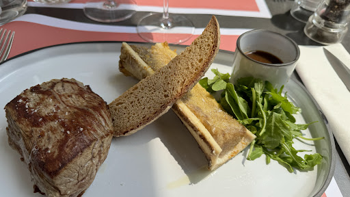 Read moreThree of us had supper here. Starter, main course, couldn't face the puddings. Service was fine, friendly, attentive. The live band was fun. The food was pretty poor. Starters: the 'contre filet' was underwhelming, the beef was tasteless, the sauce was too sweet. The ceviche of tuna was OK but swamped in a cheesy cream mousse and the avocado / fennel mixture underneath was too citrussy. Mains: the volaille came in a sauce that tasted of honey or jam — really not nice — and the prawn that came with it was mealy; the tuna steak was undercooked and tasted old; the beef fillet with marrowbone was nice. The chips had been under-fried — probably cooked once at 160 degrees — and were soft and limp. The salad side came dressed with something very sweet. The standard coffee was over-extracted, the decaff was under-extracted, and the bread was cheap. The meal cost us €150 (including 3 glasses of Gaillac red and two pressions) — we shan't be going back any time soon (also the bathrooms could do...