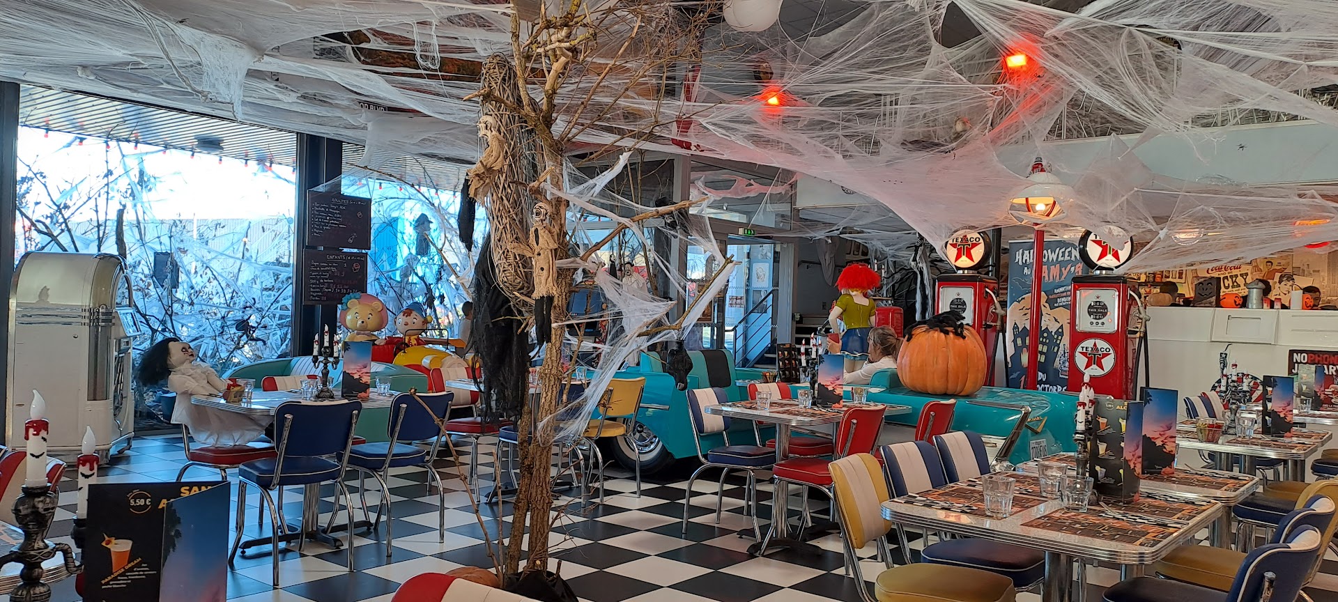 Endroit super sympa, on y vient pas pour la nourriture spĂ©cifiquement, vous y trouverez le basic avec du burger et des tapas frits, mais Ă©galement des piĂšces de viandes, des fajitas Ă faire soit mĂȘme, les desserts un peu chers mais il faut bien marger un peu et c'Ă©tait bon. Le menu enfant est gĂ©nial et prĂ©sentĂ© dans une voiture en carton, le poulet panĂ© aux graines est excellent đ. Les jeux d'arcade qui fonctionnent ne sont pas nombreux mais suffisants pour occuper des enfants de 5 Ă 10 ans je dirais. C'est trĂšs bien pour digĂ©rer le plat avant de commander un dessert. Et bien pour envoyer les enfants jouer pendant que les adultes mangent tranquillement. La dĂ©co est top, j'adore les banquettes de dĂźner. Les cotes d'agneau n'Ă©taient pas ouf mais mon mari a apprĂ©ciĂ© le burger. La prochaine fois je prendrai des fajitas aux gambas lĂ©gumes j'avais hĂ©sitĂ©, je pense que ce soit ĂȘtre sympa. En jeux biens il y a un flipper, un jeu de danse, un jeu d'arcade voiture au rez de chaussĂ©e celui-ci, un jeu de balles tir sur monstres, pour les plus petits un poney et une voiture qui bouge. Pensez Ă rĂ©server pour ne pas vous retrouver sur les chaises collĂ©s aux autres tables, les banquettes c'est vraiment l'immersion totale diner. L'Ă©quipe est jeune, souriante et dynamique. J'ai ressenti qu'il y avait une bonne organisation et une bonne gestion vu comment c'Ă©tait plein un samedi...