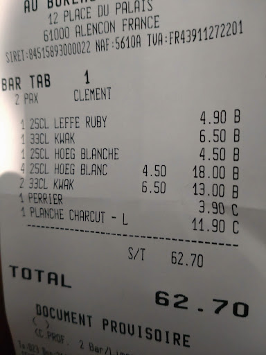 Read moreAttention à la note ! Cadre agréable, fauteuils confortables pour un moment entre 3 collègues. Service un peu hésitant, mais bon on à tous commencer un jour donc un peu de bienveillance s’impose (2 bières brunes, 1 bière blanche avec rondelle de citron). On est bien installé, alors Go une deuxième tournée 1 bière brune, 2 bières blanches cette fois sans rondelle de citron et sans explication, service aléatoire pour un même tarif. Jamais deux sans trois, troisième tournée, 1 bière brune, 1 bière blanche retour de la rondelle citron, 1 perrier (raisonnable) une planche charcuterie pour le plaisir. « Les choses se compliquent » au moment de régler nous demandons la division de la note en 3 on nous répond « on peut tout faire » et c’est vrai, résultat 31,35 euros par personne soit une note globale à 94,05 euros Wouah 8 bières, 1 Perrier et une planche charcuterie, après vérification du ticket de caisse s’est plutôt 62,70 que divise 3 ce n’est pas la même histoire ! Après une dernière vérification à la maison l’établissement a facturé 10 consommations au lieu de 9 au réel, ticket ci-joint. Dans le détail une bière blanche à 4,50 facturé en plus, je ne serai jamais s’il y aurait eu une rondelle de...