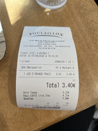 Read moreL'infrastructure en elle même est vraiment sympa, la salle est assez grande, propre et neuve. Le tout accessible aux personnes en fauteuil roulant. Par contre, je trouve les plats quand même pas mal cher (plat du jour, boisson, dessert pour 12,90€), et le systeme de fidelite (une carte ou il faut depenser une fortune pour avoir une baguette gratuite) laisse a desirer sachant que beaucoup de personnes viennent tous les jours manger et pour le cafe, je n'ai jamais vu une seule de ces personnes se faire offrir un cafe, c'est a ce moment la que l'on voit que Poullailon c'est justeune machine a profit et pas quelque chose de convivial ou de familiale.