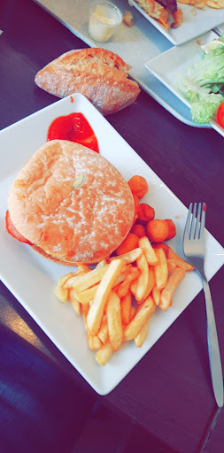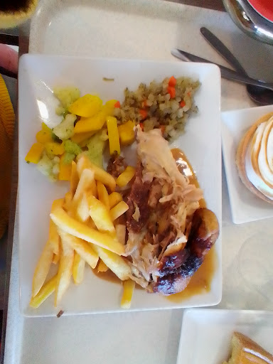 We really liked this place. It makes me think of a cross between an "all you can eat" and a carvery. On the way in you pick up a tray and cutlery (and a drink if you want one) then head to the till. Above the till is a list of dishes such as fish, steak, nuggets (for kids) maybe a dozen choices in all. You pay and are given a ticket for anything they have ready prepared or one of those buzzing pager things for something cooked to order. You take your tray with you to collect your main (don't lose or forget the ticket) and afterwards help yourself at the self-service section where they had pasta, plain rice, vegetable rice, mashed potatoes, chips, green beans, several mixes of vegetables (carrots, cauliflower, swede, parsnips, corn, etc) ratatouille, gravy, several other sauces and so on. In effect they serve you the meat/fish/whatever but after that you can have whatever and as many sides as you like. It's not fancy but it is cheap, cheerful and quite fun if you aren't used to it. They also do desserts and coffees which are quite good. Outside of lunch time they sell pancakes, waffles and drinks. Apparently my repeated questions about whether they also do Fbreakfast and Fdinner...