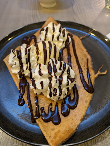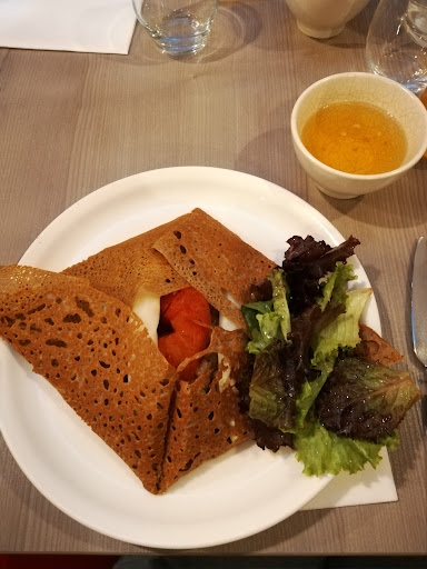 Ambiance sympathique, les serveurs sont très aimables et arrangeant. Nous avons été bien accueillie. L'attente n'était pas longue du tout. Avant d'y aller nous avions vu sur internet qu'il y avait des option vegetalienne cependant l'orque nous avons demandé aux serveurs ils étaient navré de nous dire que ce qui était marqué sur internet n'était pas juste et que cela devrait être changé, il y a bien des option végétarienne mais pas vegetalienne car de nombreux produit sont fait avec du beurre. En fin de compte ils ont pu me trouver quelques légumes fait sans beurre et j'ai pu choisir une galette sur mesure avec ceux ci. J'ai apprécié l'attention qu'ils ont porté à trouver une solution, c'était tress sympathique. Pas railleurs nous sommes arrivées assez tard et le restaurant fermé à 22h normalement, on nous a tout de même servi et laisser prendre notre temps sans jamais nous presser, on nous a même proposé des desserts alors qu'il était 22h passée (bon je pense que c'était surtout pas politesse car quand on décliné, il nous a répondu sur le ton de la plaisanterie, tant mieux car on va fermer) il nous a tout de même proposé un thé ou un café . Les galettes étaient bonne, pas les meilleur je pense mais c'est correct pour le prix. Une belle soirée,...