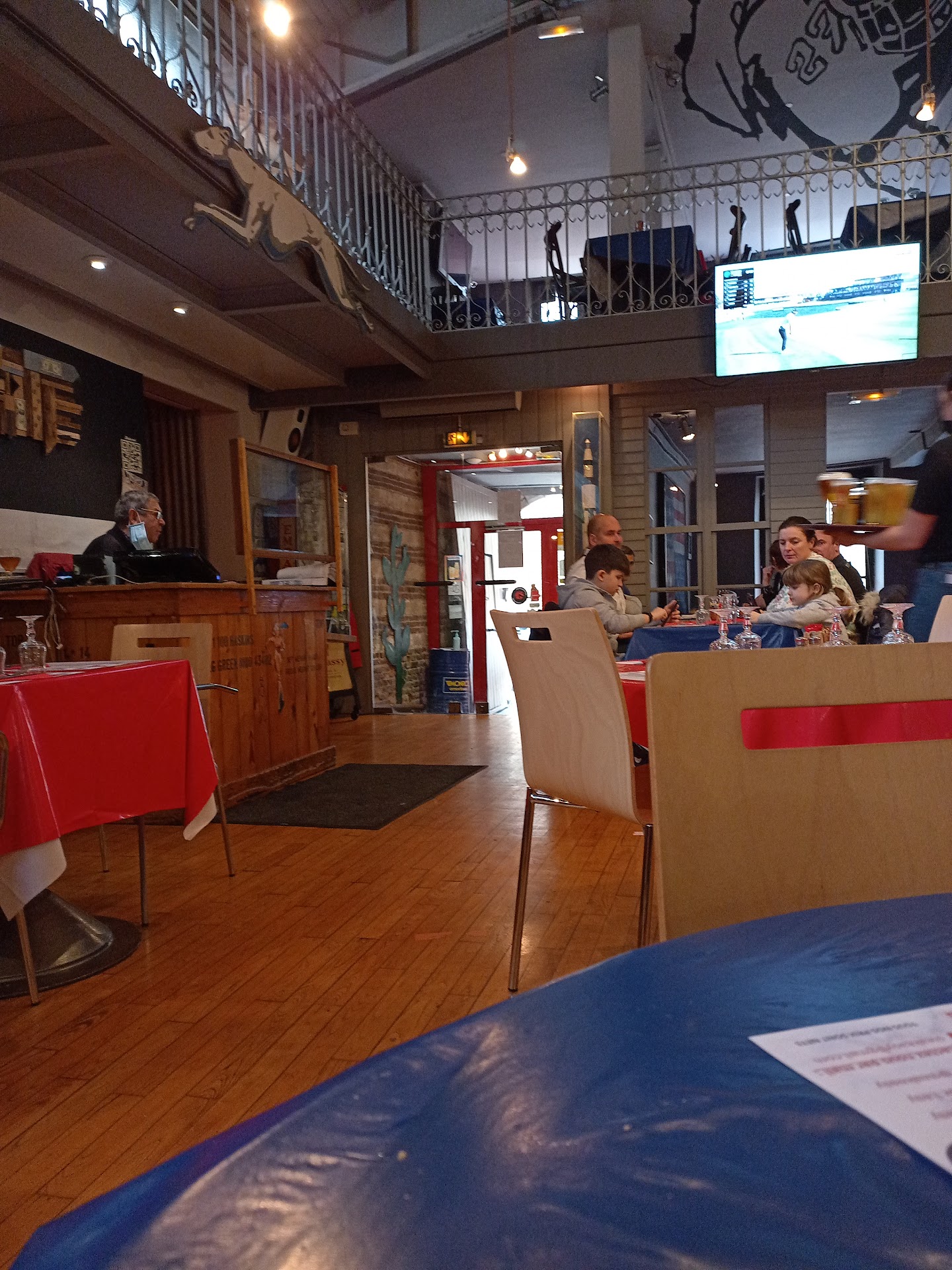 Read moreA bit of an oddity: a large hall with a red airplane hanging from the ceiling and denim jeans stuck to the walls. It felt eerily empty as I came on a Monday, but I can imagine it rammed during the weekend, it seems very kid friendly. The cuisine is perfunctory: not bad but not great. I had a bland steak tartare served alongside disappointing chips, which should have been crispier. On the plus side...