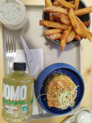 Voulant à tout prix tester je suis revenue le lendemain midi (ouverture à 12h et arrivée à 13h), je me dirige vers la borne et me rends compte qu'il y a moins de choix de tartares et d'apéro que sur la carte. (Pb de stock suite au monde sûrement, encore déçue mais pas grave) On a opté pour le tartare thai west saumon et le badem roll bbq avec les fameuses frites. J'ai aimé le fait qu'on puisse commander le tartare sans coriandre pour ceux qui n'aiment pas ça (j'en ai quand même eu, dommage) Les produits sont très frais et ça se ressent mais je n'ai pas aimé plus que ça l'association choisie pour ce tartare au saumon (j'en testerai d'autres, c'est peut être juste une question de goûts) J'ai goûté le badem roll bbq et j'ai trouvé que la sauce bbq était trop présente, elle cache le goût des autres produits. Quand aux frites, elles étaient pour la plupart bonnes niveau texture mais elles manquaient légèrement de sel, sympa mais pas incroyables. Très bonne sauce tartare par contre !!