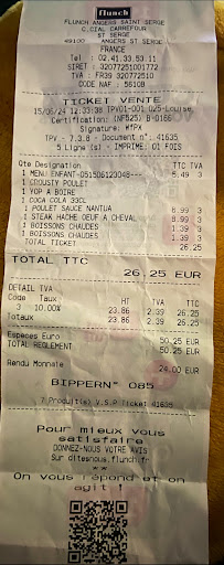 Read moreLe personnel est souriant par contre le choix des plats pas terrible rien Ă voir avec la cafette qui Ă cĂŽtĂ© de gĂ©ant espace Anjou. Pas beaucoup de choix au niveau de l'entrĂ©e et je trouve ça cher. 3 choix s pour des assiettes pour avoir de l'entrĂ©e. Une toute petite assiette pour 3 âŹavec trĂšs peu de fois par contre l'assiette moyenne pratiquement 6 ⏠pratiquement prĂȘtes la bien garni encore une fois rien Ă voir avec la cafĂšte buffet Ă volontĂ© Ă cĂŽtĂ© de gĂ©ant espace Anjou je trouve que ça vaut mieux le coup entrĂ©e Ă volontĂ© dessert Ă volontĂ© le prix varie entre 12 et 18 âŹlĂ pour 16 ⏠j'ai eu 15 steaks que j'ai demandĂ© saignant que j'ai eu bien cuit et longue au niveau de l'attente et j'ai pu prendre qu'un dessert vu les prix pĂątĂ© aux prunes qui Ă©tait assez sec ça faisait plusieurs mois que j'hĂ©sitais de venir Ă Flunch et ben j'y retournerai pas. Je trouve ça cher pour ce que c'est mĂȘme plus rentable d'aller au resto en face Royal panda 15 ⏠le midi...