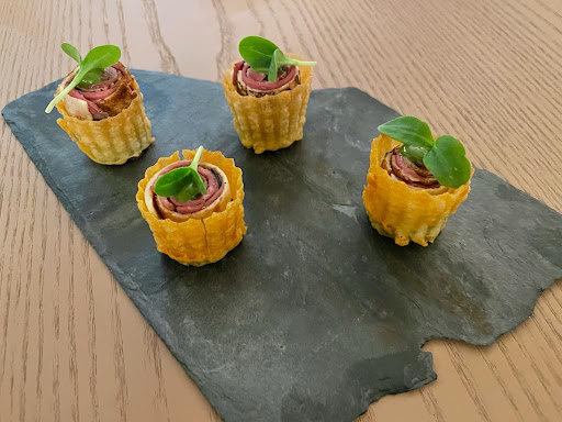 Le second amuse-bouche arrive, une lamelle de pomme de terre roulée sur elle-même, avec un morceau de langue fumée, rehaussé d’une touche végétale de souci… sans souci…
