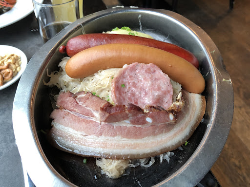 Fabulous Alsace (German-French) restaurant!! A French friend in Angers took me here (at the huge Atoll shopping complex). Way better than anything I was expecting. In general, I'm not a fan of German food, but this was something TOTALLY DIFFERENT - not your typical beanie-weanees, people! "Gourmet" was the only word I could come up with to describe the sauerkraut and sausages/wurst they have there. Nothing like what you get in a jar in the States haha. It wasn't sour nor was the different types of sausages bland like a boring hotdog. It just tasted so yummy, with a quality that I had never had before for this type of cuisine. Would definitely come here again. Moderate price, great service with everyone so friendly and attentive. I had the "menu" option with a "plat/dessert". Entree means appetizer here, so don't get that option unless that's what you want. I had a "Formule Taverne" selection with a price of about 18 euros, roughly. Specifically, I chose the following: Choucroute Brasserie Saucisse de Francfort, Strasbourg, saucisson à l'ail, poitrine fumée, pommes de terre.
