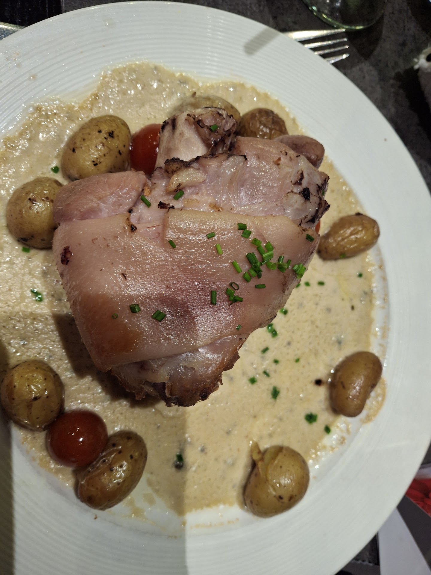 Fabulous Alsace (German-French) restaurant!! A French friend in Angers took me here (at the huge Atoll shopping complex). Way better than anything I was expecting. In general, I'm not a fan of German food, but this was something TOTALLY DIFFERENT - not your typical beanie-weanees, people! "Gourmet" was the only word I could come up with to describe the sauerkraut and sausages/wurst they have there. Nothing like what you get in a jar in the States haha. It wasn't sour nor was the different types of sausages bland like a boring hotdog. It just tasted so yummy, with a quality that I had never had before for this type of cuisine. Would definitely come here again. Moderate price, great service with everyone so friendly and attentive. I had the "menu" option with a "plat/dessert". Entree means appetizer here, so don't get that option unless that's what you want. I had a "Formule Taverne" selection with a price of about 18 euros, roughly. Specifically, I chose the following: Choucroute Brasserie Saucisse de Francfort, Strasbourg, saucisson à l'ail, poitrine fumée, pommes de terre.