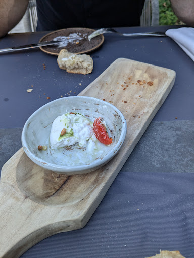Entrée Burrata à partager : une portion beaucoup trop petite pour deux personnes, et pour 15€...une déception. La Burrata à peine assaisonnée (pas de sel et seulement quelques gouttes de pesto et 4-5 noix de pin) et servie avec 4 tranches de brioche froide et dure aux fruits rouges, qui se marie très mal avec la Burrata.