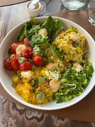 Malgré un choix délibéré des plats les plus « légers » à la carte, la cuisine s'est révélée excessivement riche. En entrée, j’ai opté pour des Ravioles d’Aubergines. Malheureusement, même ce plat "végétarien", qui aurait dû être frais et léger, était marqué par une sensation de sel omniprésente. Le Pavé de Saumon, accompagné d’une Mousseline de Brocolis, était également saturé de matières grasses et de sel. Au lieu de mettre en avant les saveurs subtiles du saumon et des légumes, la crème et le beurre dominaient le tout, rendant le plat écœurant à la longue. Le dessert, un Crumble aux Pommes, a renforcé cette impression de lourdeur. Mon ami, qui avait opté pour l’autre choix du menu, a remarqué que ses plats étaient encore plus riches en matière de composition que les miens, consolidant ainsi notre impression générale d’une cuisine excessivement lourde.
