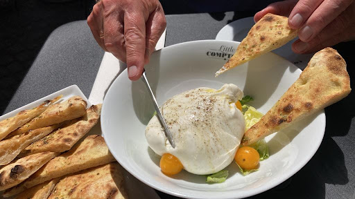 We shared a delicious big ball of Burrata (photo) and afterwards we both had a genuine Italian home-made pizza with fresh ingredients, accompanied with a glass of red Montepulciano d'Abruzzo. Next time we'll...