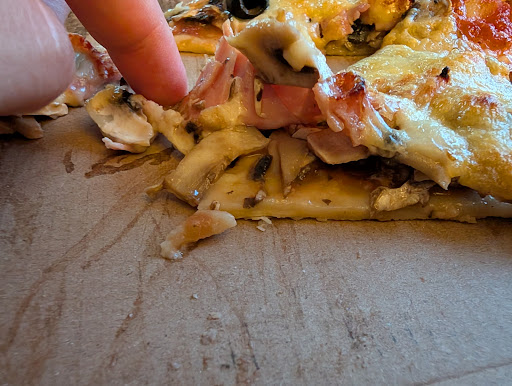 La pizza Reine a coulé pendant la route du retour sur la robe de ma conjointe. La pâte n'était pas cuite, a rejeté beaucoup de liquide et a accroché le carton du dessous.. pas très digeste. J'ai laissé le reste de la pizza. (Cf photos)