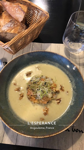 Read moreQuelle bonne surprise ! Pas facile de trouver un restaurant digne de ce nom, ouvert le dimanche, à Angoulême lorsqu'on veut faire un bon repas convivial sans être obligé de demander un prêt à sa banque ... Après avoir écarté la fast food franchisée qui rend malade, la triste bouffe industrielle sans goût et la cuisine conceptuelle qui propose des menus composés de trois très beaux et très bons mais très petits amuse-bouches présentés dans des très grandes assiettes, entrecoupés de "patiences", le choix est maigre. C'est sur les Pages jaunes, un site qui ne propose que des tables ouvertes le dimanche lorsqu'on demande cette particularité (à la différence de certains autres qui, pour générer du trafic, n'en tiennent pas compte), que nous avons trouvé L'espérance, au 8 du boulevard de Bretagne. L'extérieur ressemble à un bar urbain avec une terrasse fermée à cette période de l'année. L'accueil a été souriant et chaleureux. L'ambiance est familiale et la cuisine aussi : classique, goûteuse et copieuse. Nous avons aimé les escargots à la sauce charentaise, le belle tranche de foie gras mi-cuit parfaitement assaisonné, les gambas pour commencer, puis la souris d'agneau et le tiramisu à la pistache. Le Saint-Nicolas de Bougueil qui a arrosé le tout n'avait qu'un seul défaut, il n'était pas bio, comme tous les autres vins de la carte. Mais on m'a assuré qu'il y en aurait...