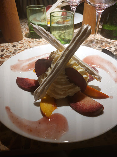 Pas de mises en bouches avec le menu à 38€. Mais une poignée de cacahuètes 😵💫 L'entrée : salade de tomates aux épices et sa burrata = Les épices choisies étaient très bonnes, ainsi que la burrata, mais les tomates incipides en cette saison d'été. Mangeant des tomates du jardin tous les jours à la maison, les papilles n'ont pas été stimulées. Plat : ballotine de volaille et Crumble de légumes du soleil. Un bon plat avec une présentation épurée. Petit bémol l'assiette froide, ce qui laisse le plat refroidir trop vite. Et donc les saveurs sont atténuées. Dessert : pavlova à la pêche = Déception totale. Une boule de glace banale à la vanille, avec une mousseline vraiment trop sucrée. La pêche était comme la tomate sans goût, et en plus elle n'était pas froide. Le coulis de pêche n'apportait aucun peps ni acidité qui pourrait contrer le sucre trop présent. Et seulement 2 sticks de meringue pour faire penser à la pavlova. En le disant, notre avis, au moment du payement, la personne était totalement fermée. Mais les 85 € étaient pour nous un sacré budget que j'ai eu l'impression de perdre...