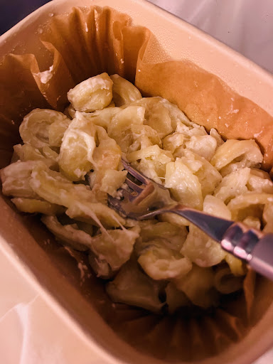 Le « pompom » a été pour le gratin au fromage. C’est bien de noter des ingrédients mais si ce n’est pour pas les sentir, ça ne sert à rien. C’est fade. De plus, la portion est vraiment petite et la salade n’apporte rien. D’ailleurs, une personne à côté de nous a décidé de demander un autre plat de ses pâtes, puisque les portions sont minimes.