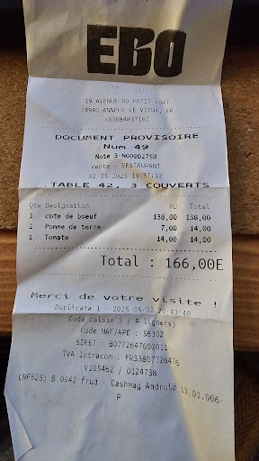 Attention à la douloureuse : -138 balles de côte de bœuf, 300g mangeables, au prorata on est sur une viande à 460 balles le kilo (à ce tarif là, on est presque sur du wagyu hein...) -14 balles pour une tomate-buratta qui était aussi crémeuse qu'une boule de mozza de supermarché. -14 balles pour 2 p'tits bols de patates (qui étaient bonnes, faut leur reconnaître ça !)