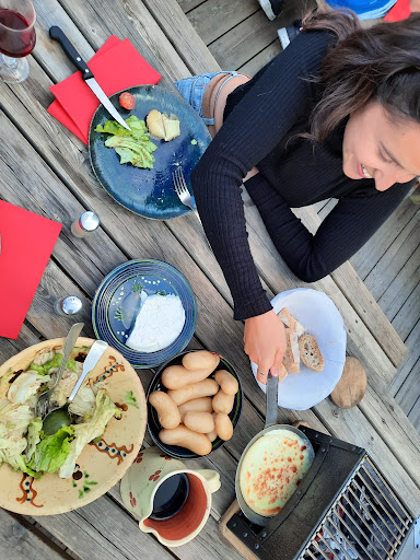 Introduit par des petits toasts et un apéritif, Le repas à été délicieux, nous avons pu déguster à volonté leurs reblochons (produits avec leur élevage) fondus au charbon de bois sur des bonnes pommes de terre et de la salade ainsi que de la tomme fraîche de reblochon à peine préparée du matin (je ne suis pas sûr du nom que cela porte)… si il vous reste de la place les desserts sont très bons eux aussi…