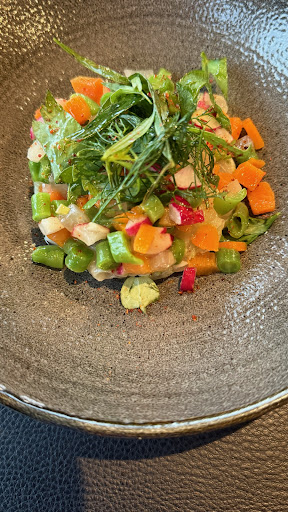 You will never find this place without the reviews or word of mouth! In the dark, it is esp. difficult, but, because we had read reviews, we found it and if you look at the photos, you'll see why you could easily miss this restaurant. We came here because of the reviews and photos, and it was a 15 mins walk to where we were staying. Before we start on the food, the WC IS inside the restaurant, it's well hidden behind the black door on the same side as the living-wall plants! Myself and many other patrons had fun finding it!! A suggestion to management, make the sign more obvious, maybe on the centre of the door. Anyway, they were very clean! Ha ha! 3 course evening meal the Le Haut menu for 41 Euros, including an amuse bouche and 3 types of unlimited bread and table water, was great! Excellent English spoken by all 3 servers. Each dish was explained in great detail. Portion sizes good. You don't leave hungry! Friendly, unhurried service in a cosily lit space. The plastic chairs could do with some cushions, because they looked chic but they weren't super comfortable. There are, however, some long cushioned seats along the wall, where the toilet door is! The flavours we find, are always best in the starters. For some reason, the mains never quite match the uniqueness of the starters in these types of fine dining restaurants. There is only a choice of 2 dishes, if you go for the Le Haut Menu, so I would suggest share each dish, that way you get to try 6 different dishes in total. 5 stars well deserved. We went to Le Petit Thiou the other day which also gets 4.9 on Google reviews, it was great too, so trust us! We also like the fact that there is no dodgy service charge.The website menu is up to date. Bien...