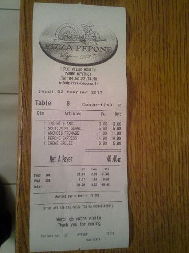 (Mon avis: Depuis que cette pizzeria est gĂ©rĂ©e avec les fils pepone cela est devenu nâimporte quoi ! Jâai connu pepone toute petite oĂč mari et femme Ă©taient au commande, câĂ©tait trĂšs bon pizza trĂšs gĂ©nĂ©reuse, Ă©quipe dynamique dâailleurs la patronne Ă©tait trĂšs agrĂ©able et souriante ! Ce qui nâest clairement plus le cas aujourdâhui! Depuis quâelle est au commande avec ses fils câest une catastrophe. Pizza bien plus petite, pas bcp garnie, salade manque cruellement de prĂ©sentation et de goĂ»t. Et derniĂšrement ... ArrivĂ©s Ă 12h30, nous avons Ă©tĂ© servi Ă 13h50 alors quâil y avait un enfant ... au bout dâun long Moment nous rĂ©clamons la pizza enfant et tampis pour nous adultes... le fils le plus jeune Ă©tait au commande des pizzas nous lâentendons dire « si les gens ne sont pas contents et pressĂ©s ils nâont quâa Pas commander de pizzas ! » je rĂȘve ?! Nous sommes dans une pizzeria ? Si en cuisine ça ne suit pas quand nous sommes arrivĂ©s il fallait nous refuser ! Nos pizzas sont arrivĂ©es sauf celle de notre enfant !!!! En attendant je lui donne de la mienne et heureusement car quand la sienne est arrivĂ©e elle Ă©tait immangeable ! Sauce tomate qui piquait Ă©normĂ©ment ! GĂ©nial pour un enfant ! Nous discutons avec les gens Ă cĂŽtĂ© de notre table ça faisait plus dâune heure quâils attendaient et nous avons entendu des gens rĂ©clamer leur pizza Ă 13h30 alors quâils recommençaient Ă travailler Ă 14h alors quâils Ă©taient arrivĂ©s avant nous! Le deuxiĂšme fils arrive les mains dans les poches trĂšs hautain, regarde les clients ne donne mĂȘme pas un coup de mains... en mĂȘme temps vu les rĂ©ponses aux commentaires sur les rĂ©seaux sociaux venant de lui ça ne mâĂ©tonne mĂȘme pas ! Enfin bref vu le prix et ce quâon a en retour câest Ă Ă©viter !!!! Mais je tiens Ă dire ce jour lĂ nous avons Ă©tĂ© servi par une serveuse assez jeune qui Ă©tait superbe ! Elle se donnait du mal pour les clients, elle courrait de partout alors quâon ne savait que lui donner des ordres au lieu de lâaider ... bien dommage que cette pizzeria soit...