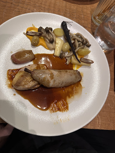 We loved everything about our experience! The restaurant is small, simple and cozy. Service is kind and with a good timing. The menu has just a few choices, and we appreciated that! We got one menu for 45 euro (entree plat dessert) and one for 53 (same but with a second entree that we shared): I would recommend our choice. The fois gras was delicious and served with cooked apricots on top of a macaron, what an original and tasty idea! Then the second appetizer was worth the stop: riz de veau (some part of the veal) with langoustine.. again one unusual combination that was so well thought. The main dish was duck with mushrooms and great. Same for desserts. All portions were correct. Hope to be back here soon! I recommend to book in advance, only 20 seats and known in town so it's hard to...