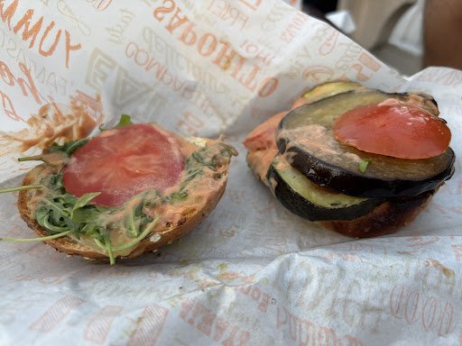 Option végétarienne : le « burger » se résumait à du pain, une tranche de raclette si fine qu’on aurait pu la passer au scanner, et quelques légumes baignés dans l’huile. Pour 13 €, j’ai découvert le concept révolutionnaire du sandwich « invisible en bouche ». Bravo pour l’innovation culinaire.
