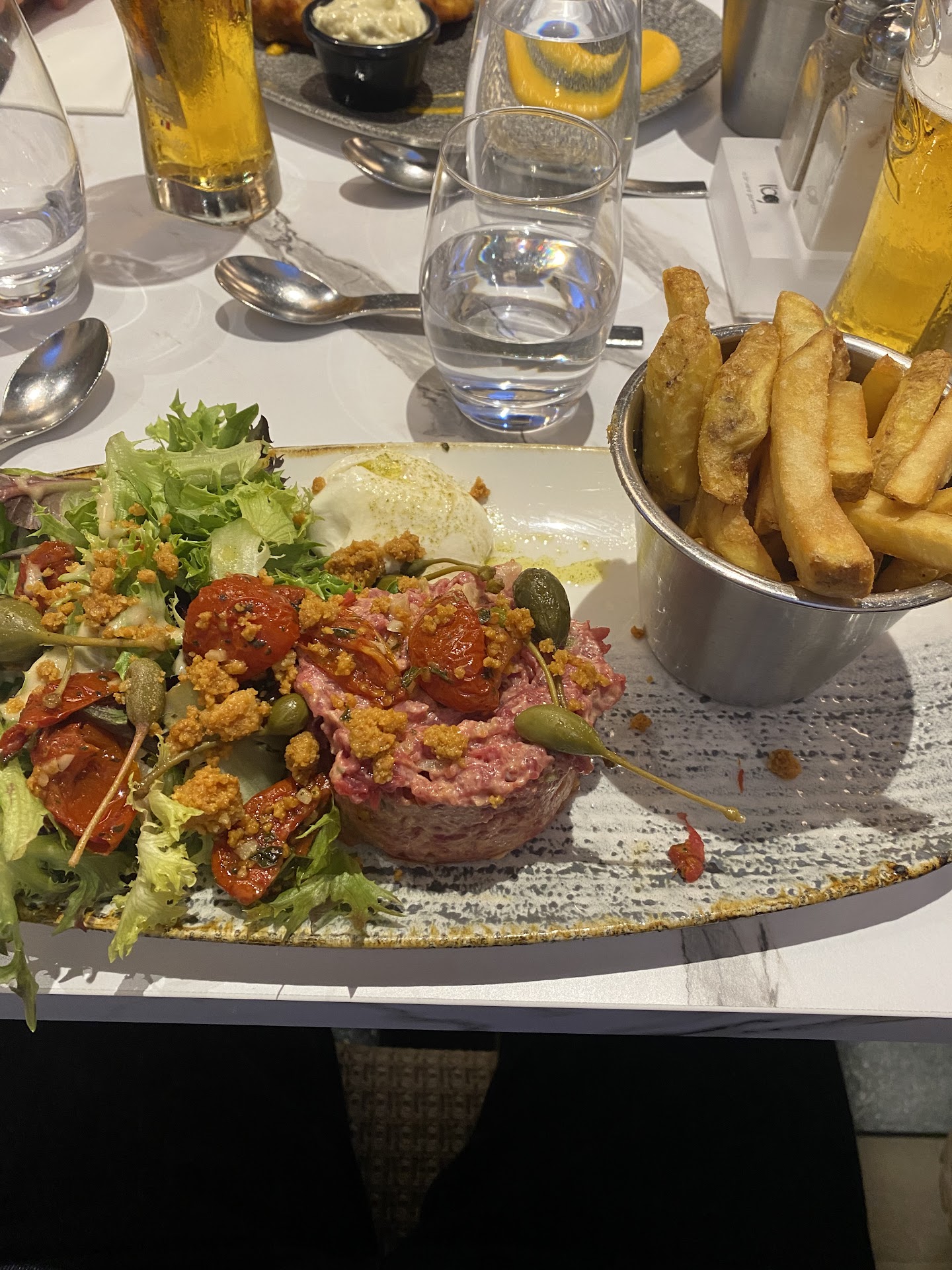 Pour ce qui est de manger, nous avons commandĂ© 3 authentiques burgers, 1 tartare LBG et une escalope milanaise. Les burgers et lâescalope Ă©taient trĂšs corrects avec frites et salade. Un petit plus pour le tartare qui est copieux avec ses accompagnements et trĂšs bien assaisonnĂ© avec photo Ă lâappui (je dĂ©bute dans la photographie donc soyez indulgent avec moi svp).