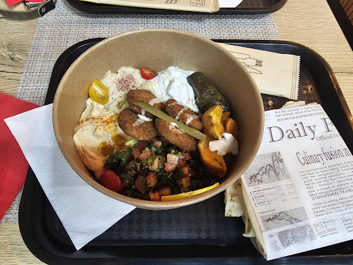 Read moreWe went there for dinner ~20:30 on a weekday. The place was empty then. It was very good value for money. Lots of food and nice service. Both of us ordered the falafel bowl and got a mix of dips, salad, falafel and bread with it. It was very filling and tasty. The only thing I would say is that even though we ate there, all the utensils...
