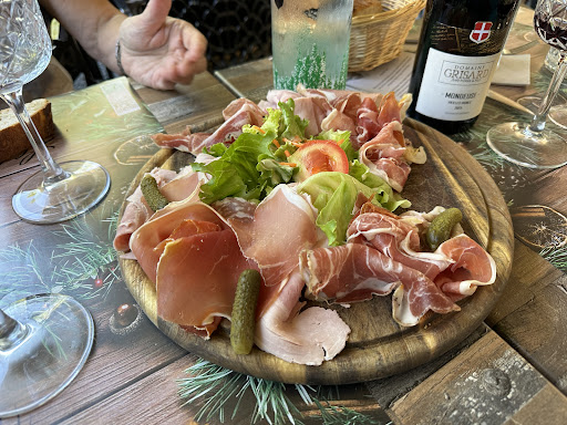 Notez qu'il vaut mieux réserver L'ambiance est topissime! L'équipe au service est jeune, mais elle détrÎne bien des "restaurants" sur Annecy...qui sont devenus des gargoilles infùmes (peu d'exceptions...) Ils savent recevoir, conseiller... on a pris nos apéritifs. Puis à notre signal on nous a servi la Planche Montagne qu'on s'est partagée en 3: une diversité de charcuteries de la Salaison du Mont Charvin, qui sont à Doussard. Tout excellent!(photo)