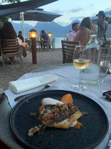 ArrivĂ© au restaurant Ă 20h30 nous avons eu la grande surprise d'ĂȘtre placĂ© totalement en retrait de la vue du lac, tout juste Ă cĂŽtĂ© d'une table d'enfants (je vous passe les cries, les pleures etc... Je n'ai rien contre ces enfants, c'est tout Ă fait normal, mais s'il-vous-plaĂźt... Au vu du prix, placĂ© nous correctement !). Tout le long du repas nos voisins Ă©taient sous les petits soins des serveurs alors que nous, nous avions Ă©tĂ© totalement laissĂ© Ă l'abandon. Pourtant nous sommes loin d'ĂȘtre des gens dĂ©sagrĂ©ables, nous sommes souriant, nous ne sentons pas mauvais (enfin pas Ă ma connaissance).
