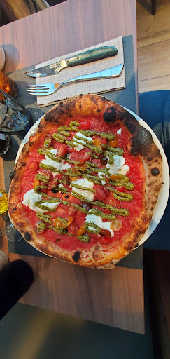 Really bad service, but really good pizza. The lasagna was good too. Relatively new place but with limited parking. A big screen TV was running a video of⊠a fireplace. Service: one of those French places where they act as if they are doing you a favor by seating you, taking your order, bringing your food, etc. I asked if the lasagna came with a salad - didnât really get an answer so I ordered a green salad. Turned out the lasagna did have a side of exactly the same salad. Food came out of order: they brought spaghetti for my son first, then my lasagna, then the pizza took forever to arrive. We might return only because itâs conveniently close...