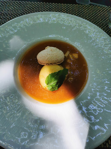 Le dessert... Gaspacho de pêche, nous sommes dans le sud... En plein été et on trouve dans la sauce de la pomme, de l'ananas et de l'orange. Ni local ni de saison.