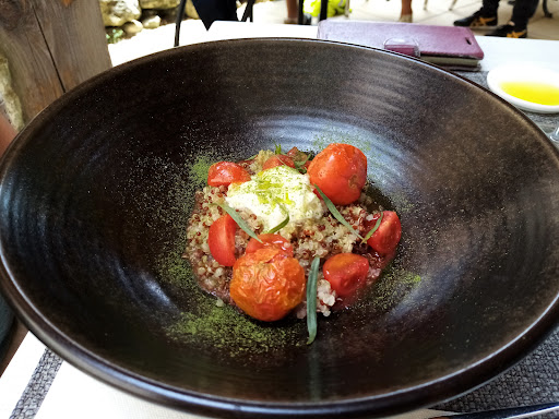 Read moreCuisine inventive et fraîche, les plats sont parfumés. Pour exemple, dans le menu du 25 juillet 2023 nous avons pu déguster : en amuse-bouche, une crème de petit-pois et édamames (fèves de soja) avec une écume au raifort. En entrée, pour l'un une salade de quinoa avec des tomates et du stracciatella, un fromage frais italien. Pour l'autre, trois jolies gambas accompagnées d'un leche de tigre (une sauce à base de lait de coco, de citronnelle, d'ail, de piment et de Curcuma) sur un lit de carottes. C'était délicieux, très parfumé. En plat, nous avons tous les deux opté pour le poisson du jour : du thon rouge servi avec des courgettes crues et une sauce verte à la verveine. Là encore, l'alliance des saveurs était surprenante et raffinée. Pour le dessert, l'un a pris un yaourt à la grecque avec des morceaux de pêche jaune, de la liqueur "strega" confectionnée à base d'herbes et un granola aux noisettes fait maison. L'autre a choisi le "fromage de l'instant", un fromage frais servi avec des lamelles de poivron rouge cuit et un coulis de fraise. C'était une association de goûts inattendue mais plutôt agréable au palais.