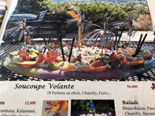 Read moreL'Art glacier de prime abord a tous les codes d'une institution de la glace dans le Luberon à l'instar du Quillé dans les Bouches du Rhône : parking aux arbres majestueux, magnifique bâtisse décorée de lumières le soir, vue imprenable sur la campagne, un serveur vient vous installer à table... jusqu'ici le programme semble réjouissant. En passant devant les tables, on s'aperçoit que les coupes ne sont pas vides (première surprise), la serveuse nous amène une carte plastifiée avec très peu de choix de coupes, des photos pas vendeuses, dignes d'une carte de restaurant chinois (on a réellement cherché l'orange givrée et le mystère), toutes les coupes sont servies avec de la meringue (énorme gaspillage alimentaire puisqu'elle reste souvent dans les coupes), des décorations de type plumes ou autres froufrous non seulement inutiles et pas hygiéniques, mais pas non plus à l'image de l'établissement viennent compléter le tout. (Toute cette fioriture sert elle à donner une impression de remplissage des coupes?) Ou devrais-je dire des assiettes. L'assiette ne garde pas la glace au frais, elle arrive fondue à table étant donné la chaleur. J'ai eu le droit pour ma part à une assiette en forme de chien qui m'a fait plus penser à une gamelle à croquettes qu'au contenant d'une coupe à 12 euros (prix moyen à la carte). La glace artisanale, ou pas, n'a rien de transcendant non plus. Si vous venez en famille ou entre amis, vous en aurez vite pour 100 euros. Personnellement, je ne recommande pas, si Etchebest passait par ici, il aurait beaucoup à redire sur le fond et la forme! Dommage car l'arrivée était...