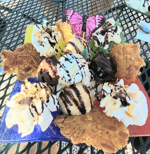 La carte des glaces et les assiettes qui circulent montrent des décorations assez chatoyantes avec des meringues, de la chantilly et des coulis qui peuvent faire la joie des enfants et aussi des adultes qui ont la nostalgie des présentations plus anciennes de leur enfance.