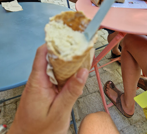 Read moreAwful experience. We were there in a group of five, they brought 3 of the orders wrong, including the ice cream of a friend who is gluten intolerant, told them very clearly that, and got a cup with a biscuit in it (and when he asked to please have a new ice cream, was given just the same one without the biscuit. They clearly don't get the gravity of gluten intolerance). If you buy a cone (my case), you, a paying customer, cannot sit at their tables. Total nonsense but ok, I didn't say a word and did what their asked. The worse part though, a friend bought a crepe, was given a tasting spoon to cut and eat it, was denied proper cutlery when she asked, the crepe glued to the paper "plate" it was served into and she was unable to eat it, she never got the coffee she paid for, and when she went in to ask for her money back, the owner took the crepe from her hand, threw it in the trash, grabbed her by an arm and pushed her aggressively out. Rude, disrespectful, and on top of that, they give no receipt. Strongly recommend...