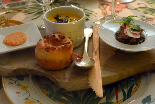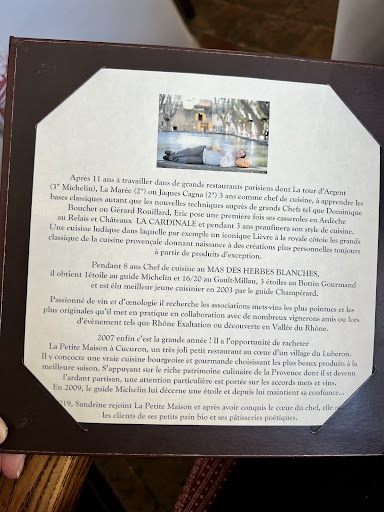 This restaurant was a fabulous experience and we both said we were so glad we drove a beautiful hour to get to Cucuron! The upstairs dining room was elegant and old and really took you back to another century. Every dish was prepared with elegance and fine care. Overall, the balance of the meal was too heavy for my personal tastes. The amusé bouches were very “fish” powerful, and unfortunately not to my personal liking. I should have said I had a seafood allergy, but forgot. The entrée was chicken, morel and foie gras, and also, interesting but also not to my liking. The beef cheek was delectable and I ate mine and my dining partners! And the desserts were marvelous. Oh, the wine pairing were wonderful! Absolutely try the homemade orange wine for the aperitif! The chef greeted us and said goodbye and that was wonderful and unusual!!! Like I said at the beginning, a truly unique experience in an absolutely gorgeous...