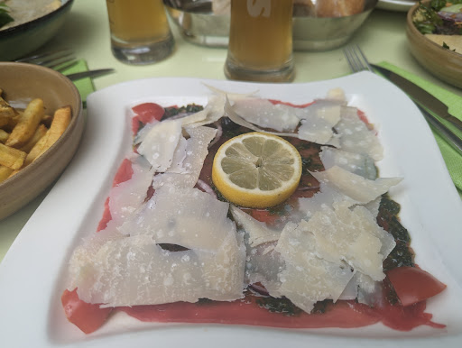 The food was good. My husband and I both had the chicken which was excellent and a huge portion. But when I asked to take away my leftovers they said, no! No box, no foil, not even some paper to wrap it in! This is a very expensive little town, where the parking costs minimum 8 euros. But this was ridiculous. I had a whole chicken leg and half my fries leftover. So I wrapped it up in a couple of napkins, along with all the bread that we hadn’t even touched. The servers overall were rushed and mostly unfriendly even though everything is automated. All the food looked good and I can’t fault ours for that. But the system and bad...