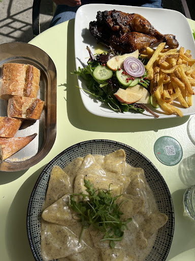The food was good. My husband and I both had the chicken which was excellent and a huge portion. But when I asked to take away my leftovers they said, no! No box, no foil, not even some paper to wrap it in! This is a very expensive little town, where the parking costs minimum 8 euros. But this was ridiculous. I had a whole chicken leg and half my fries leftover. So I wrapped it up in a couple of napkins, along with all the bread that we hadnât even touched. The servers overall were rushed and mostly unfriendly even though everything is automated. All the food looked good and I canât fault ours for that. But the system and bad...