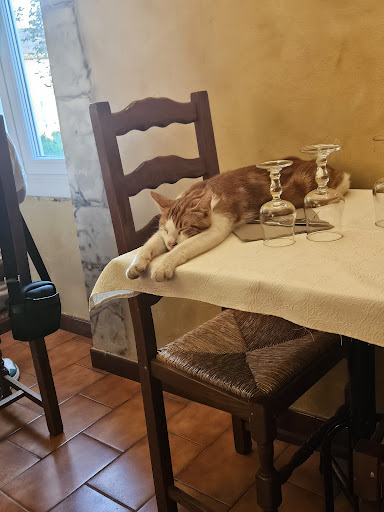 Read moreQuoi dire de plus. Regardez la photo. J'adore les bêtes, mais un chat n'a rien à faire sur une table, et encore moins un table de restaurant,et quandon voitça, ça ne laisse présager rien de bon mais il étaittrop tard (heure) pour se mettreàlarecherched'unautre, service long même pour un plat en direct, je ne peux pas dire que ma salade au chèvre était mauvaise, mais il faut déjà en vouloir pour râter une salade, le dessert crème brûler elle était granuleuse pas vraiment de goût. Je...