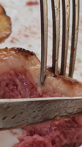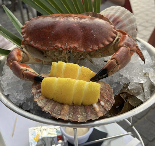 We had oysters and iberian ham. Both of these were really good. But then the main course, one of us had the crab ( €25,- ) which u get with a small cup of mayonnaise. U only get 2 claws and a few legs, the rest was empty or not included, also the mayonnaise was not a good combination. We also all had fries as a side dish but only the crab had mayonnaise, when we asked for more he sighed and said we already had mayonnaise. He then came back with another small cup for only one person. The rest had steak ( €32,- ) which was undercooked. My friend asked for medium but got almost rare instead, also 40% of the steak was just fat so not chewable. Service was lower then expected. We wanted to take our time to eat but got asked if we were ready to order repeatedly in 15 minutes. When we did not know what to order the waiter sighed or rolled his eyes. He did not have professional attitude at all which made it quite uncomfortable at times. One of the staff members was also vaping inside and on the terrace. The toilets can’t lock from inside but were clean. The location is great but not really...