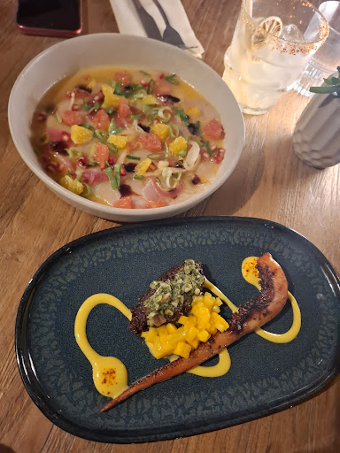 Wir haben das Restaurant mit einer Gruppe von neun Personen besucht und waren von Anfang an begeistert. Von außen wirkt es eher unauffällig – vor allem vom Parkplatz aus – doch sobald man eintritt, erwartet einen ein stilvolles, warmes und entspanntes Ambiente. Man fühlt sich sofort willkommen und gut aufgehoben.