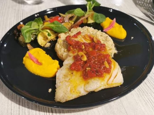 La cuisine, ce pour quoi nous venons principalement... Nous avons été vraiment ravis !! Les ravioles de thon dans son bouillon en entrée... Excellent ! (pas en grosse quantité, mais très bon, et cela reste une entrée) Pour le plat, Le Filet de lieu jaune, servi avec une vinaigrette ail piquillos et petits légumes, était également un vrai régal !! Une belle présentation, raffinée et colorée, plein de saveurs...