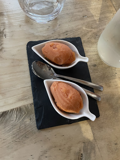 Read morePetir restaurant situé dans les escaliers à Argelès-Gazost. Seulement 26 places, 1 service le midi et 1 le soir. Autant vous dire que sans réservation pas de possibilités de repas! Nous avons donc réservé le mardi pour un dîner le vendredi soir. Très bon accueil de Céline qui laisse ses clients se placer où ils le souhaitent. A la carte: 2 entrées, 2 plats, assiette de fromages, 2 desserts. Tout est fait maison!! Entrée, plat, dessert: 34 euros. Possibilité de prendre les 2 entrées ou les 2 plats. Possibilité aussi de choisir l'accord mets/vins. Avec l'apéritif nous avons eu le droit à un gaspacho de melon. En entrée : cromesquis de volaille tzatziki de concombre pour moi, tomate couleur et crème glacée pour Mr, En plat: truite avec son flan de courgette et son boulgour bio pour nous 2, Dessert: abricot sous plusieurs formes: tarte amandine, sorbet et compotée. Avec le café, un financier au miel local est proposé par les restaurateurs. Céline et Mathieu sont très agréables et parlent avec plaisir des produits qu'ils travaillent, de leur provenance et des accords avec les vins qu'ils connaissent bien. Si vous êtes à Argelès-Gazost c'est un...