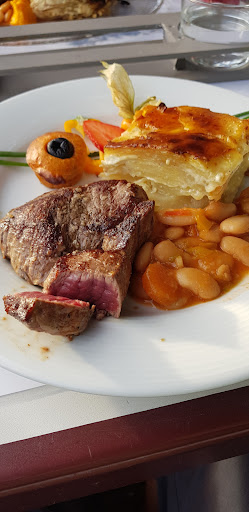 Franse keuken; Op het menu staan bijvoorbeeld een rijke salade met warme geitenkaas op getoast stokbrood met in de salade zelfs druifjes en andere frisse vruchtjes. Maar hier serveren ze ook een echte goede biefstuk (even vragen om "saignant" af te bakken zie foto) De aardappelgratin die erbij geserveerd wordt, heb ik nog nooit zo lekker gehad.