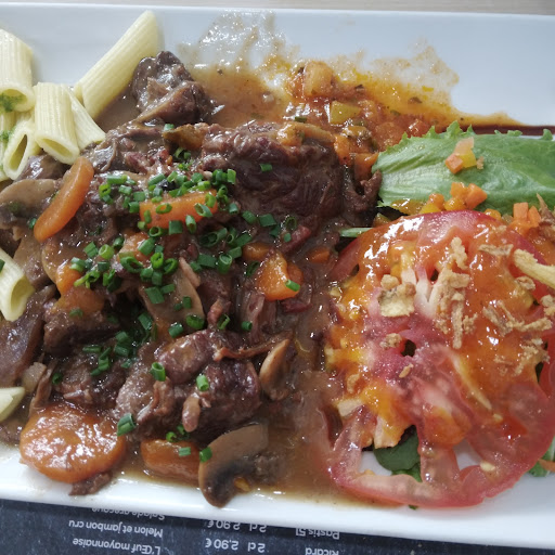 Pause déjeuner dans cet intermarché. Pas de bonjour de la serveuse trop occupée à discuter avec des gens qu'elle connaît. On a attendu une bonne 20 minutes avant que le jeune du bar vienne nous voir. Le repas est excellent, bien servi, et c'est bon. La serveuse a toujours discuté avec les autres personnes qui rentraient. Mon se demande pour quoi...